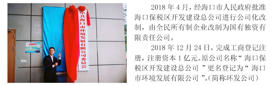 ??谑协h(huán)境發(fā)展有限公司是??谑袑?lài)?guó)有獨(dú)資有限責(zé)任公司,于2018年12月正式掛牌運(yùn)營(yíng),注冊(cè)資本1億元,由1993年12月成立的??诒6悈^(qū)開(kāi)發(fā)建設(shè)總公司進(jìn)行公司化改制而成,核心業(yè)務(wù)為環(huán)境環(huán)衛(wèi)產(chǎn)業(yè)投資和運(yùn)營(yíng)、資產(chǎn)運(yùn)營(yíng)和管理,培育業(yè)務(wù)為工程管理